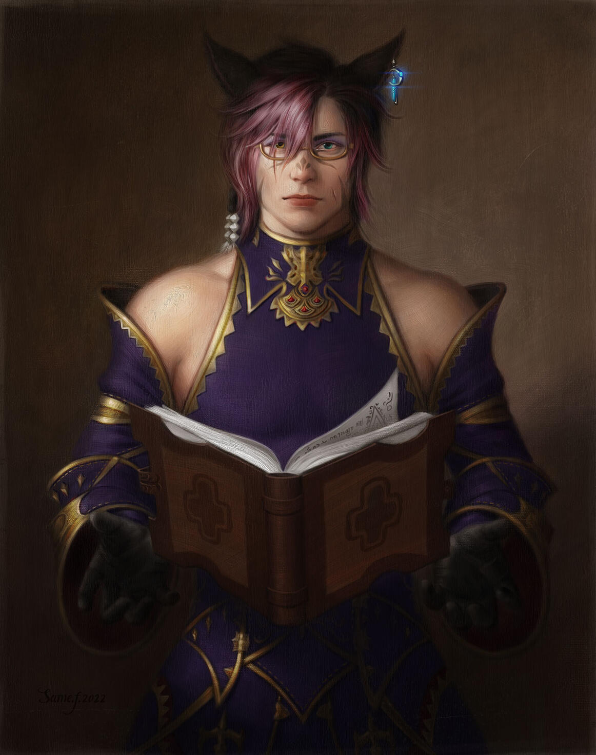 It was a graduation gift.On the wall deep within the heart of the arcanum studium hung an oil painting Thubyrgeim had commissioned on a whim. There was a refined quality of the figure in the painting and a gentleness reflected in his eyes. The book painted in the figure’s hands invoked the scent of old parchment and paper vanillin.“I think I speak for all of us here in the guild when I say, It was a necessity. After all, you are the guild’s child. I couldn’t help myself,” came an affectionate laugh.Xel’xe’s tail stood rigid for a split second as he craned his neck to regard Thubyrgeim at his side. He could almost hear K’rhid’s voice echoing words of agreement with a mocking tone, making his ears twitch in annoyance. Knowing the guild leader, he would aim to make the sentimental moment more embarrassing if he was there. Thubyrgeim once had to explain to Xel’xe that it was out of their fondness for him that they teased him.“It’s been a real treat getting to watch you grow, not only academically in the guild, but as a person,” She praised.In her eyes he was still just a kitten poring over tome after tome, as studious as the day she found him. A youngling she watched grow into a fine young adult with those same qualities with pride. Soon Xel’xe would be off for bigger and brighter vistas. One of which was a passion and dream of his.A library.He smiled as he thought about his dream, a public repository of books meant to share knowledge with the masses. Unlike the people of Sharlayan, Xel’xe believed to his core that knowledge was power and one meant to be shared, not coveted. He believed it was how knowledge was used that made it inherently good or bad. Thank the twelve, he wasn’t alone, as Thubyrgeim offered to help file the permits needed.“You may not think it, but you do cut quite the handsome figure,” A bubbling chortle escaped from Thubyrgeim, cutting off Xel’xe’s thoughts. “Not to mention that natural hair of yours. It makes you stick out in a crowd.”“I know, I know…”Xel’xe felt his cheeks redden as he brought a hand up to brush strands of blue and bubblegum pink away from his glasses. She had a point when it came to his dual toned hair. It meant he was easy to identify by those who knew him. Even if he’d seen something similar in the bustling streets, he was still somehow unique. He willed away his blush as he stared at the portrait that reflected his person. It was a thoughtful gift from Thubyrgeim.“Just… Please, PLEASE, don’t brag about me to any of the new students, or ANY students for that matter…” He mumbled, embarrassed.Xel’xe hoped.He hoped that his smile did not give away the quiet thought he allowed himself to share in a whisper. Xel’xe also smiled, joyful that he had managed to make his name well known among his fellow arcanists and teachers.Covering her mouth with her hand, Thubyrgeim concealed her smile. If it was an accident or not, it still made her smile from ear to ear. A warmth spread in her chest as she considered his plea halfheartedly. After all, she had heard him say it.No matter how quiet.Even if he tried to deny it, Thubyrgeim heard what he’d called her.“... mom.”